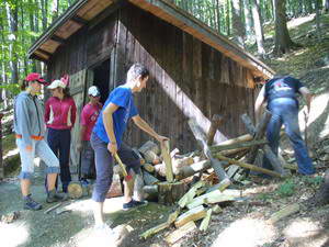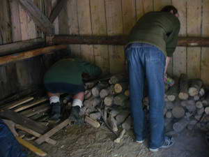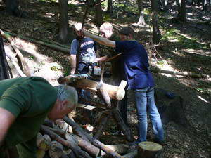 ![]() Keďže sme potrebovali odviesť do bunkra motorovú pílu, vedúci sa musel obetovať a išiel autom. Slávka išla prvá a po 100 rokoch sme konečne došli na prvú prestávku všetci naraz. Keď už sme si mysleli, že nám chýba iba kúsok a sme v bunkri, zbadali sme krížom cez celú cestu padnutý obrovský strom. Museli sme prenášať bicykle cez neho a nebolo to zrovna ľahké. Ale keď sme konečne zdolali poslednú prekážku, uvideli sme bunker a začali sme sa usmievať, lebo sme vedeli, že si konečne oddýchneme. ![]() Už sme boli dávno oddýchnutí, keď začala fungovať aj Urbičkova slávna píla. Vďaka nej sme mali veľmi rýchlo narezanú obrovskú kopu dreva, ktorú ale bolo treba nasekať, aby sa mohlo drevo odložiť. Tak sa mladší chalani pustili do práce a začali sekať, čo to dalo. Pod Petriným dohľadom potom drevo ukladali do šopy. ![]()