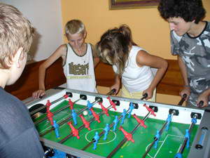 Keď sme sa ubytovali, vybalili, zoznámili s chatou a doniesli celý nakúpený proviant do kuchyne, hneď sme išli pokrstiť stolný futbal, ktorý sme