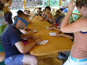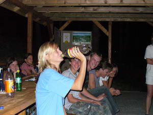 Dnes nebol veľmi čas na prípravu ohňa, tak sme večer strávili v altánku pri fakliach s hrou Activity show. Bola to súťaž dvojíc, ktoré napodobňovali,