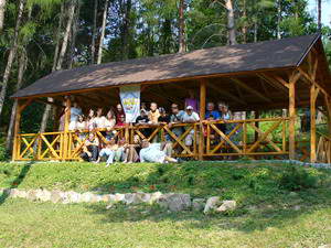 vystúpili z áut, prekvapilo nás krásne prostredie. Všade okolo je les, je tam postavený veľký drevený altánok s dlhým stolom, vedľa pekne upravené