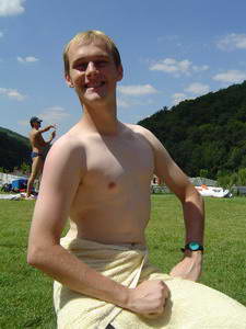Len čo sme si v tábore trochu vydýchli, hneď sme si obliekli plavky a vyrazili prvý krát do Vodného raja. Pri pokladni sme dostali náramky s kreditom, za ktorý sme si mohli v celom areáli kupovať čo sme chceli. Problém bol len v tom, že sme to pri odchode museli zaplatiť. Hneď ako sme vošli dnu, našli sme si voľné miesto, rozložili si veci a utekali do vody. Ako prvé sme objavili šmýkačku a tobogán. Tam sme sa vyjašili ako malé deti. Neviem čo si o nás mysleli tí, čo nás nepoznali. Keď sme sa už nevládali hýbať, vrátili sme sa naspäť do tábora. Chvíľu trvalo kým sme sa všetci osprchovali, a preto, keď sme skončili, bol čas na prípravu ohňa. Tešili sme sa na večer, lebo sa malo grilovať.