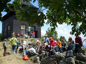 Potom sme sa odviezli na jazero Počúvadlo. Tam sme zaparkovali autá a vydali sa na výstup na Sitno. Stúpali sme asi hodinku lesom a posledných niekoľko 100 metrov po drevených schodoch. Keď sme konečne unavení vyšli až na vrch, doslova sme sa zvalili na zem a najedli sa. Od rána nám poriadne vyhladlo.